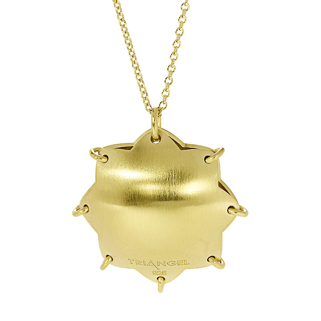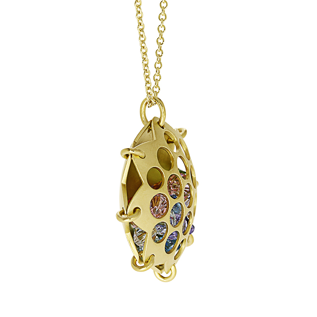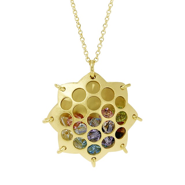 Dieser außergewöhnliche Anhänger besticht durch sein innovatives „Loch-Design“, das den Blick auf ein funkelndes Geheimnis im Inneren freigibt. Gefertigt aus hochwertigem 925er Sterlingsilber und mit einer edlen Gelbgold-Plattierung veredelt, strahlt das Schmuckstück eine warme, luxuriöse Eleganz aus. Die stern- oder blütenförmige Silhouette des Anhängers bildet einen schützenden Käfig für eine Vielzahl an facettenreich geschliffenen, synthetischen Kristallen. Durch die kreisförmigen Aussparungen auf der Vorderseite schimmern die Steine in den Farben des Regenbogens – von zartem Rosé und Violett bis hin zu frischem Grün und kühlem Blau.